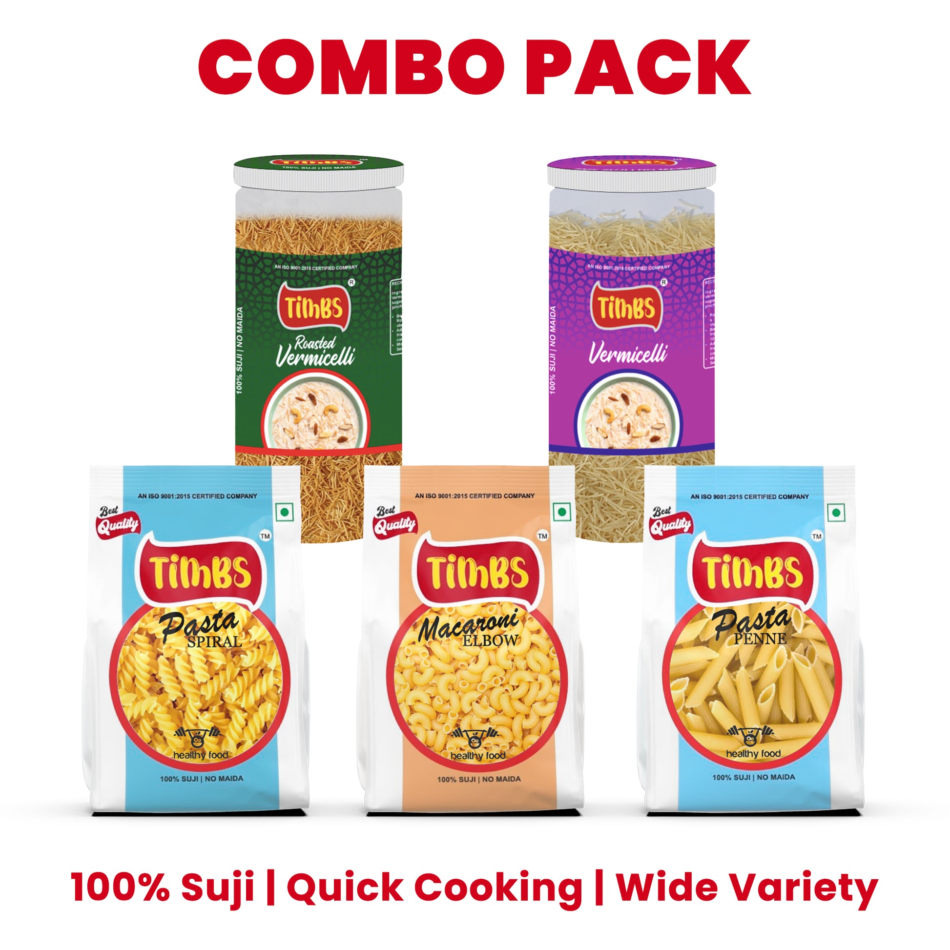 The Timbs Family Feast Pack is a 5-in-1 combo of your favorite suji-based goodies – 3 classic pasta shapes + 2 vermicelli jars – all made from 100% suji, with no maida, for meals that are both tasty and wholesome.